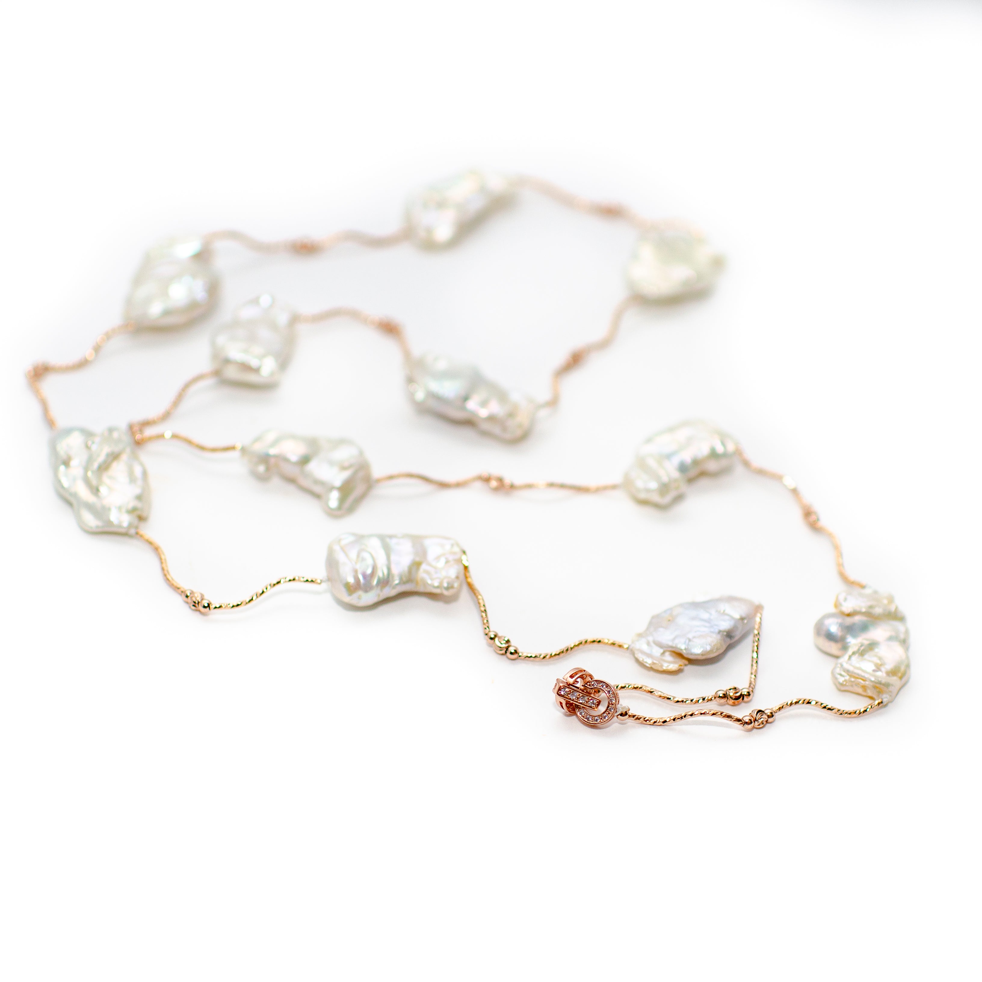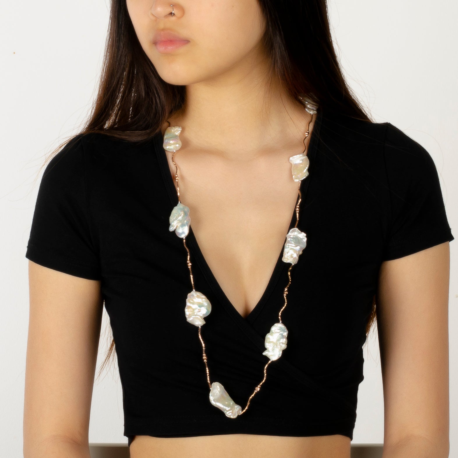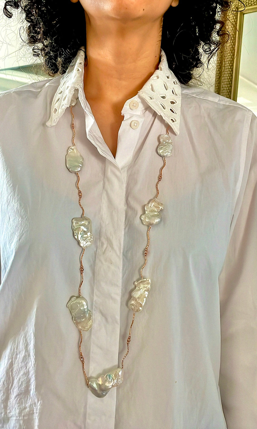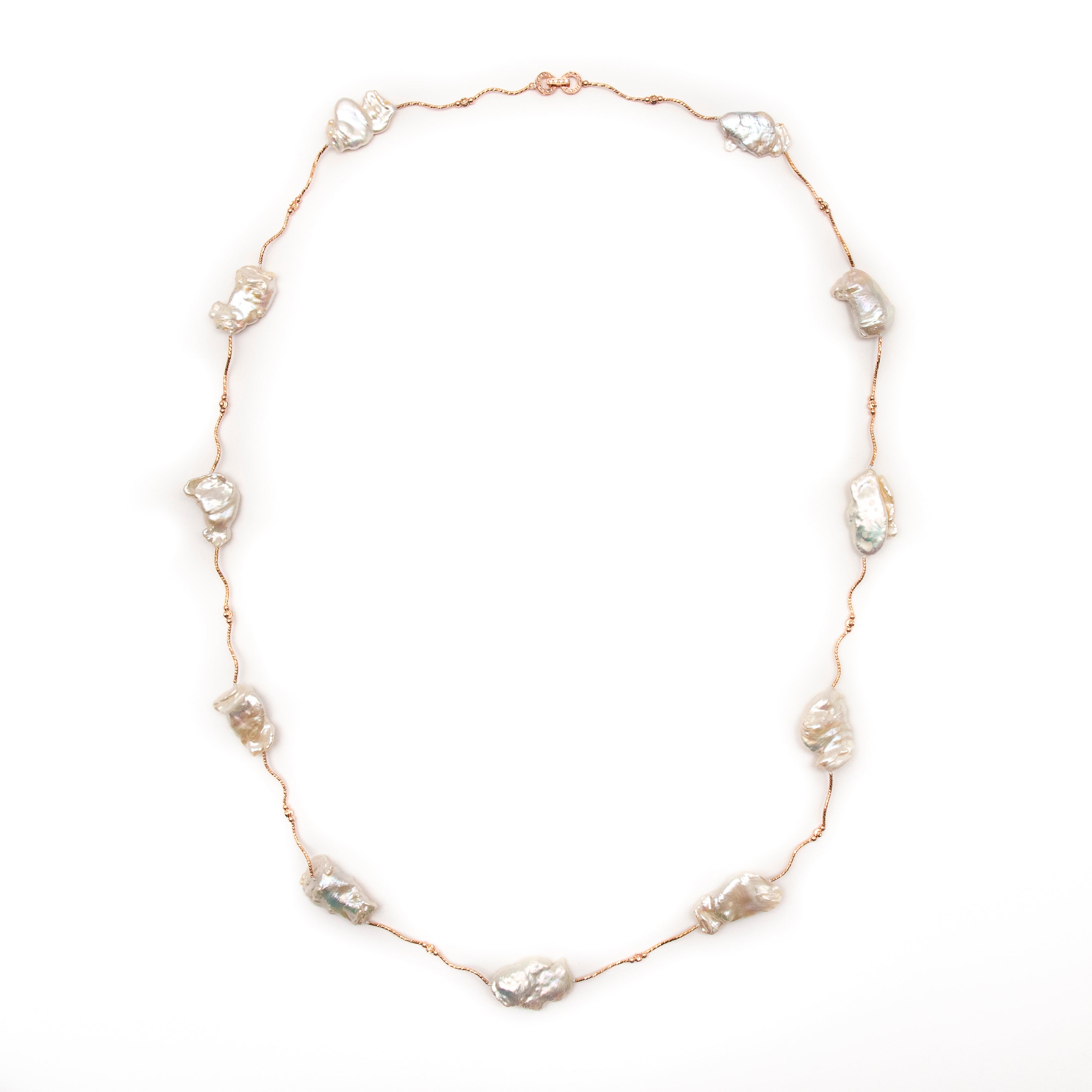 -Necklace is made with fine quality very chunky white baroque pearls with rose gold wire -The necklace is strung on 18K rose gold plated wire -Length of the necklace is 40 inches and has a comfortable clasp.It can be worn single or doubled