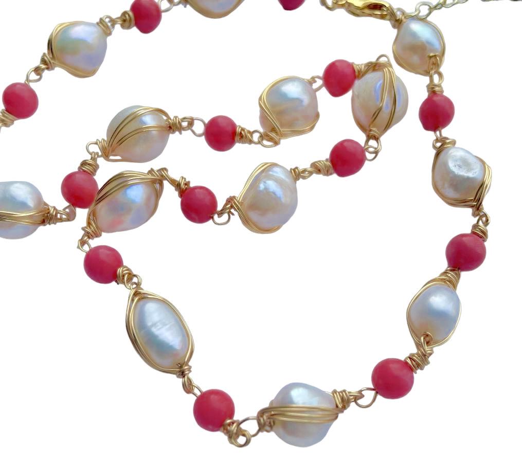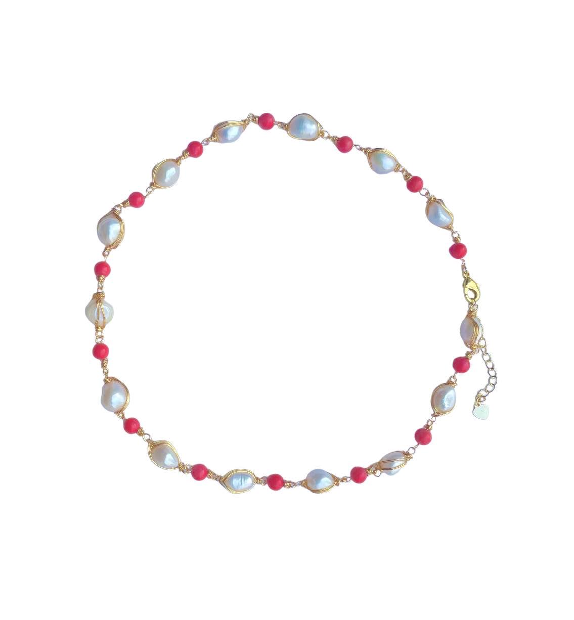 -Beautiful trinket pearl and orange coral necklace -Handmade with 18K gold plated wire
