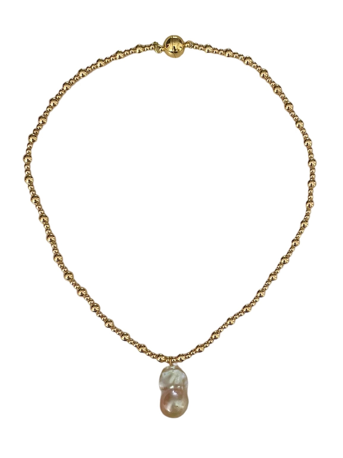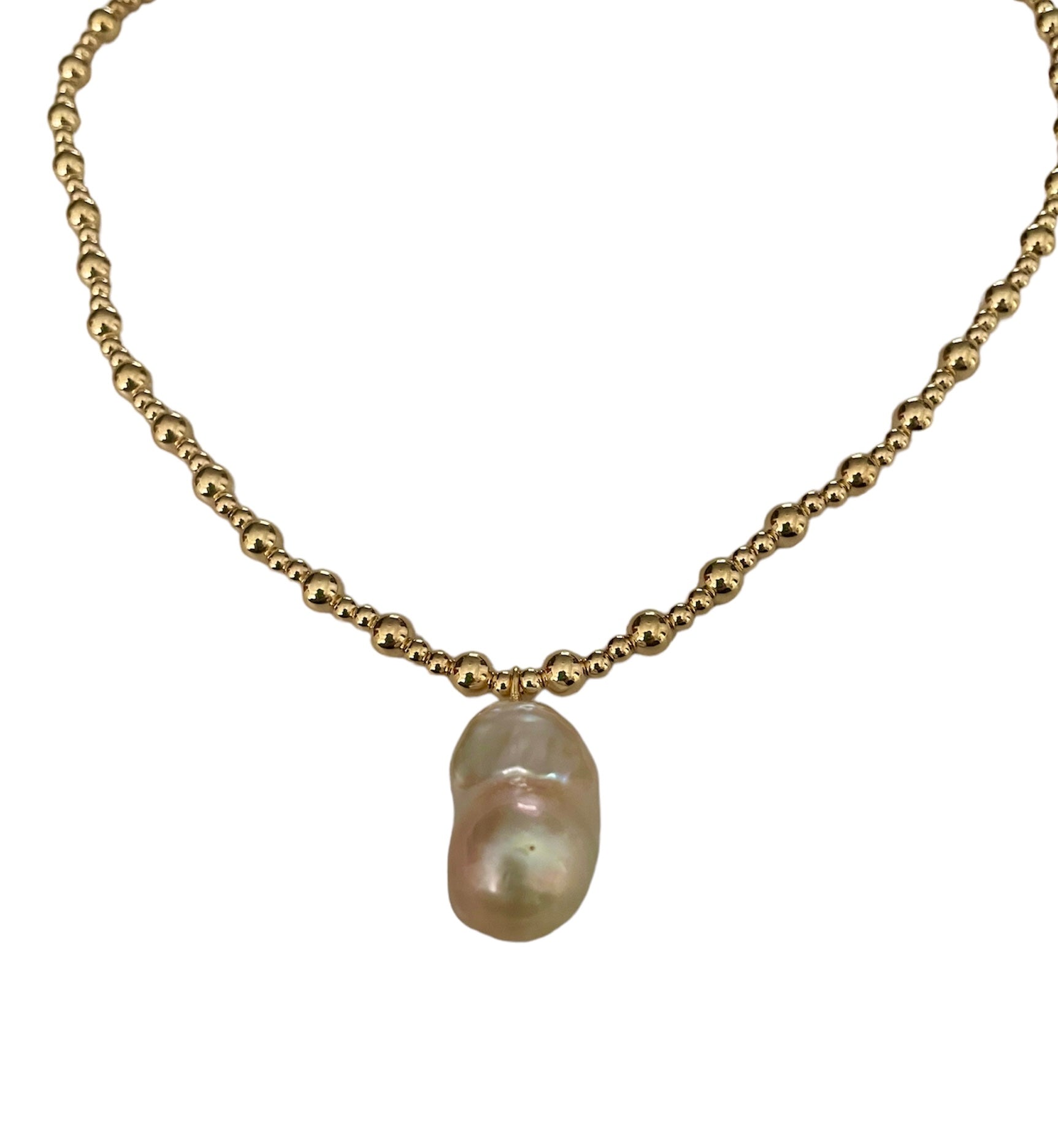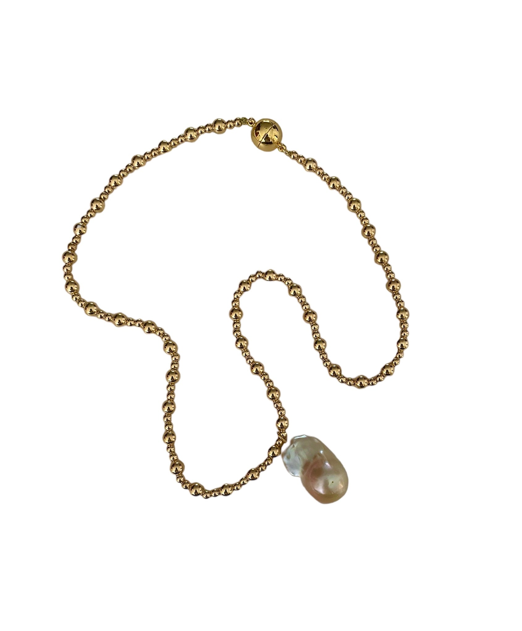 -Beautiful 18K gold bead with chunky baroque drop -Length of the necklace is 20 inches with a mix of big and small gold beads -Due to nature of the natural gemstones and pearls, each piece may slightly vary in size