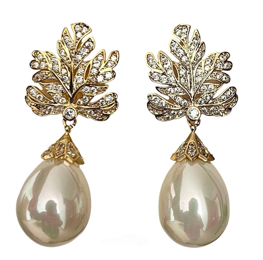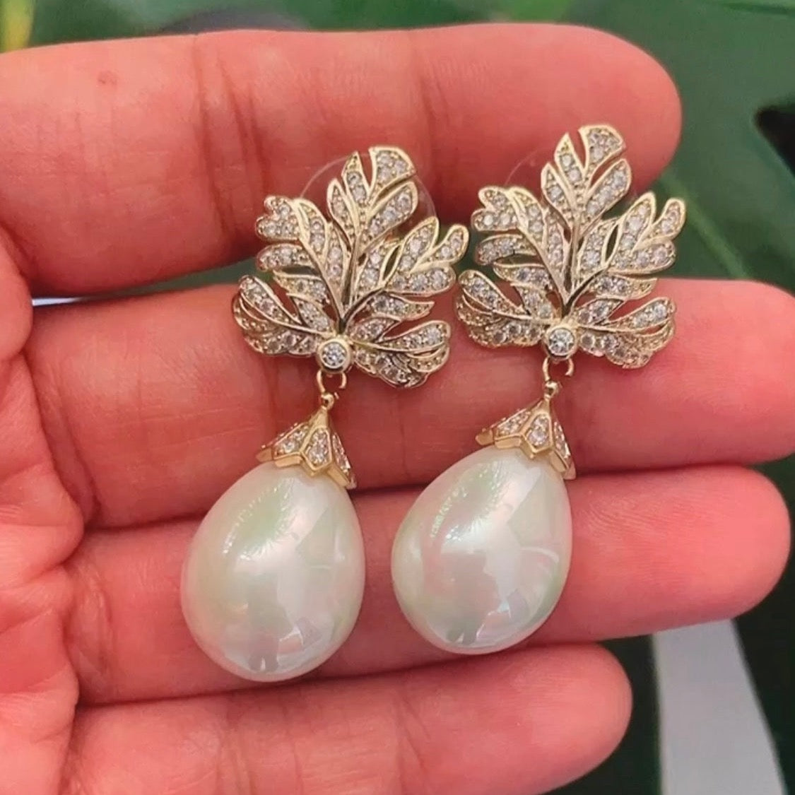 -Beautiful white pearl earrings with zirconia top -Set in sterling silver with gold plating -Hook earrings for pierced ears