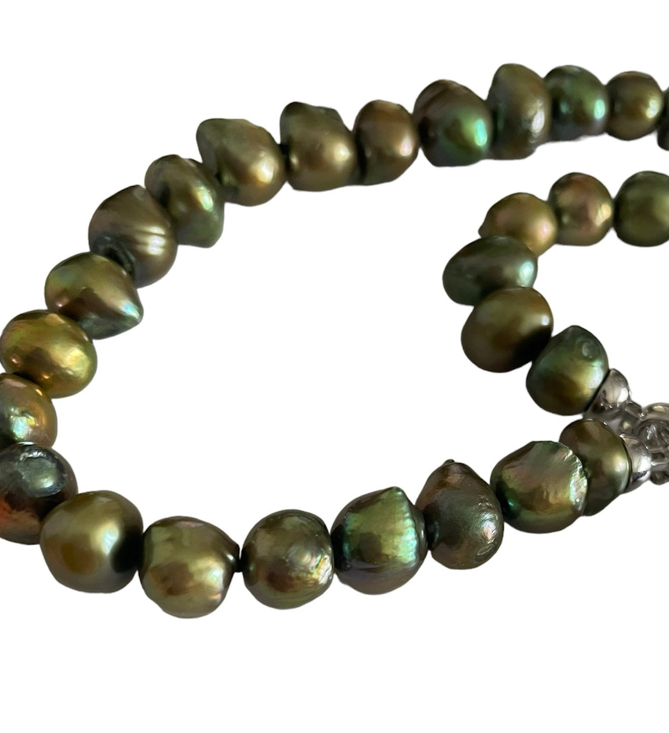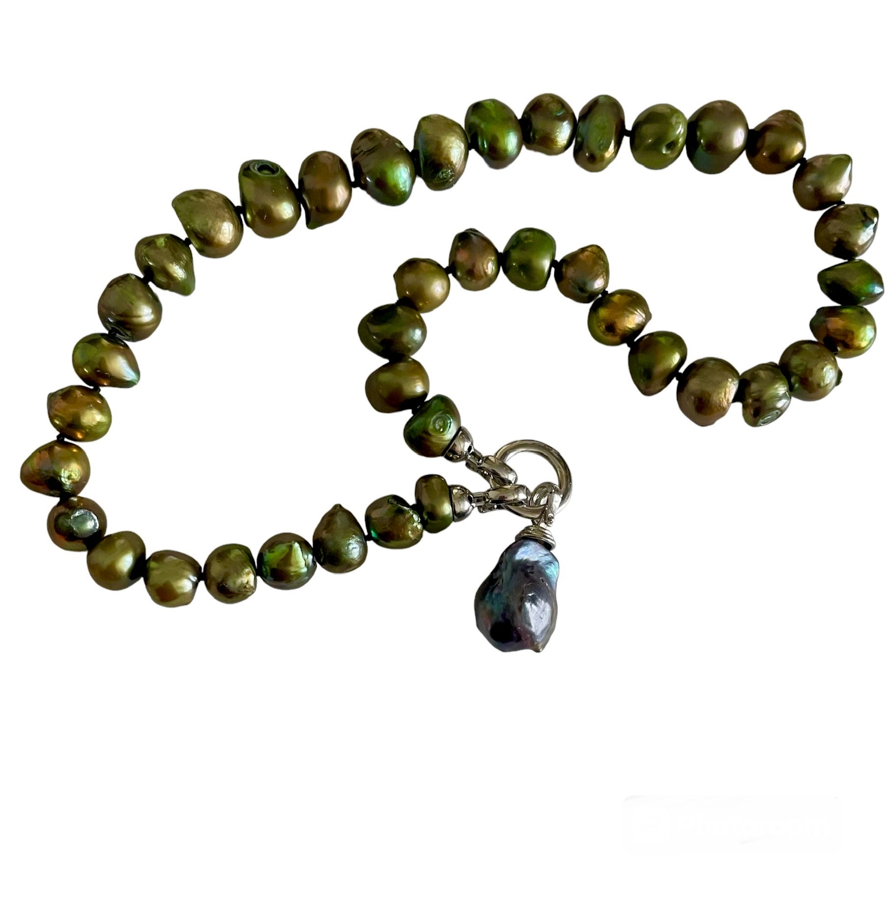 -Classic natural green fresh water pearl necklace with a black baroque pearl drop