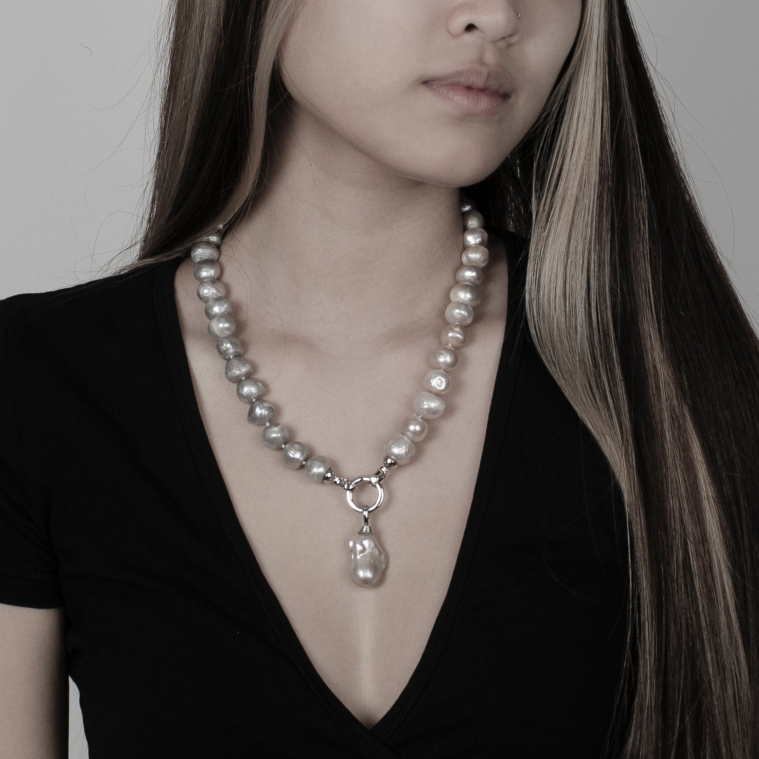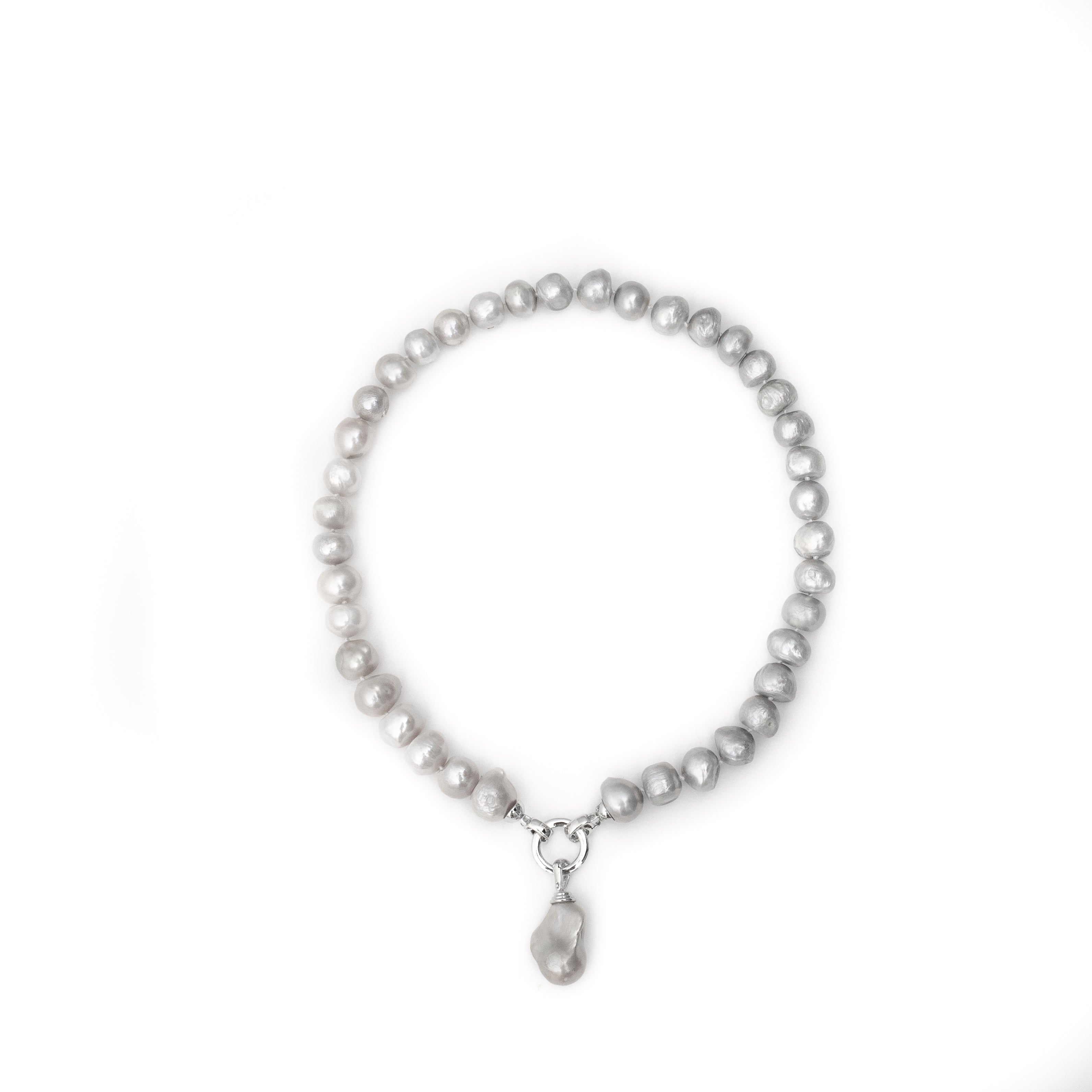 -Classic grey fresh water pearl necklace with a baroque pearl drop