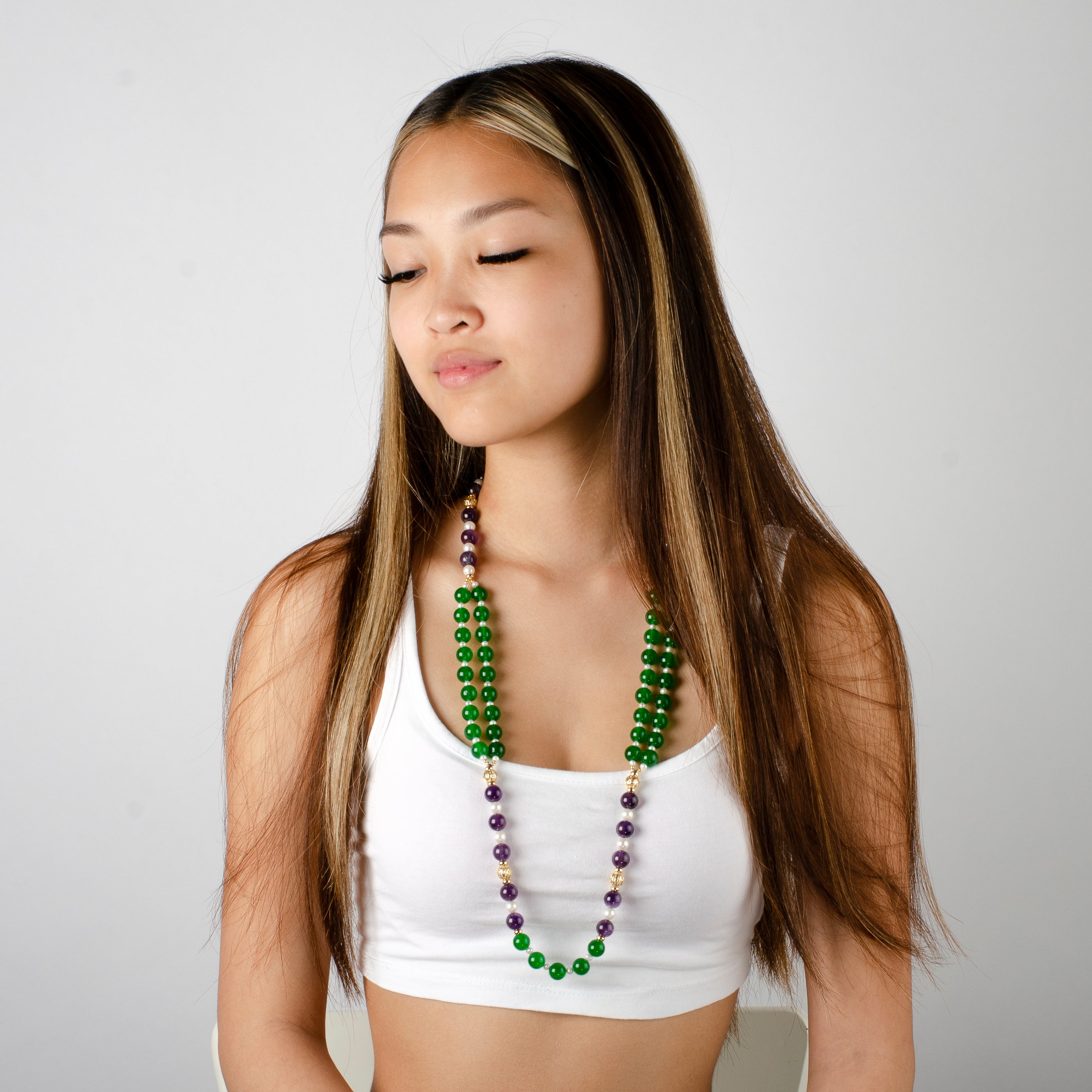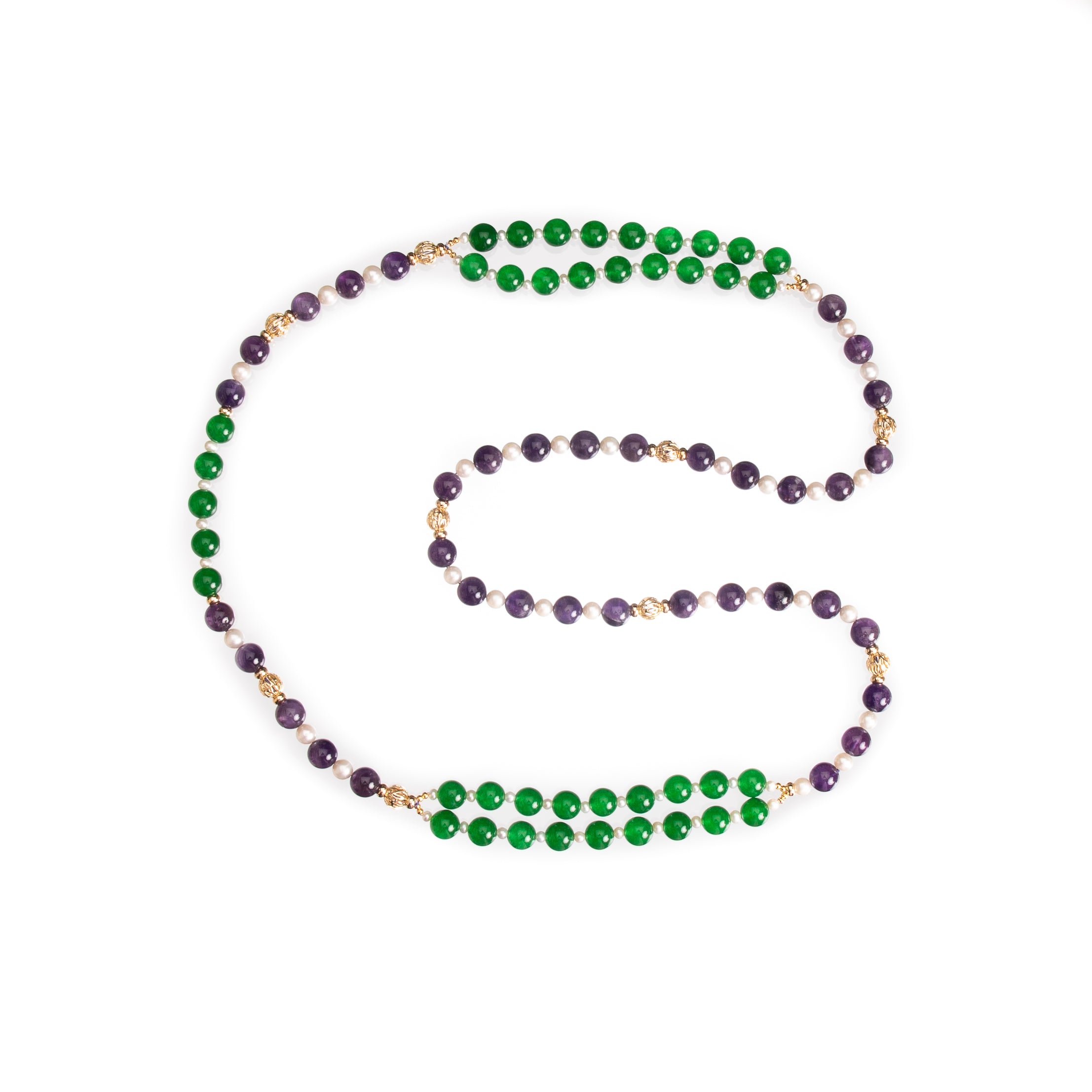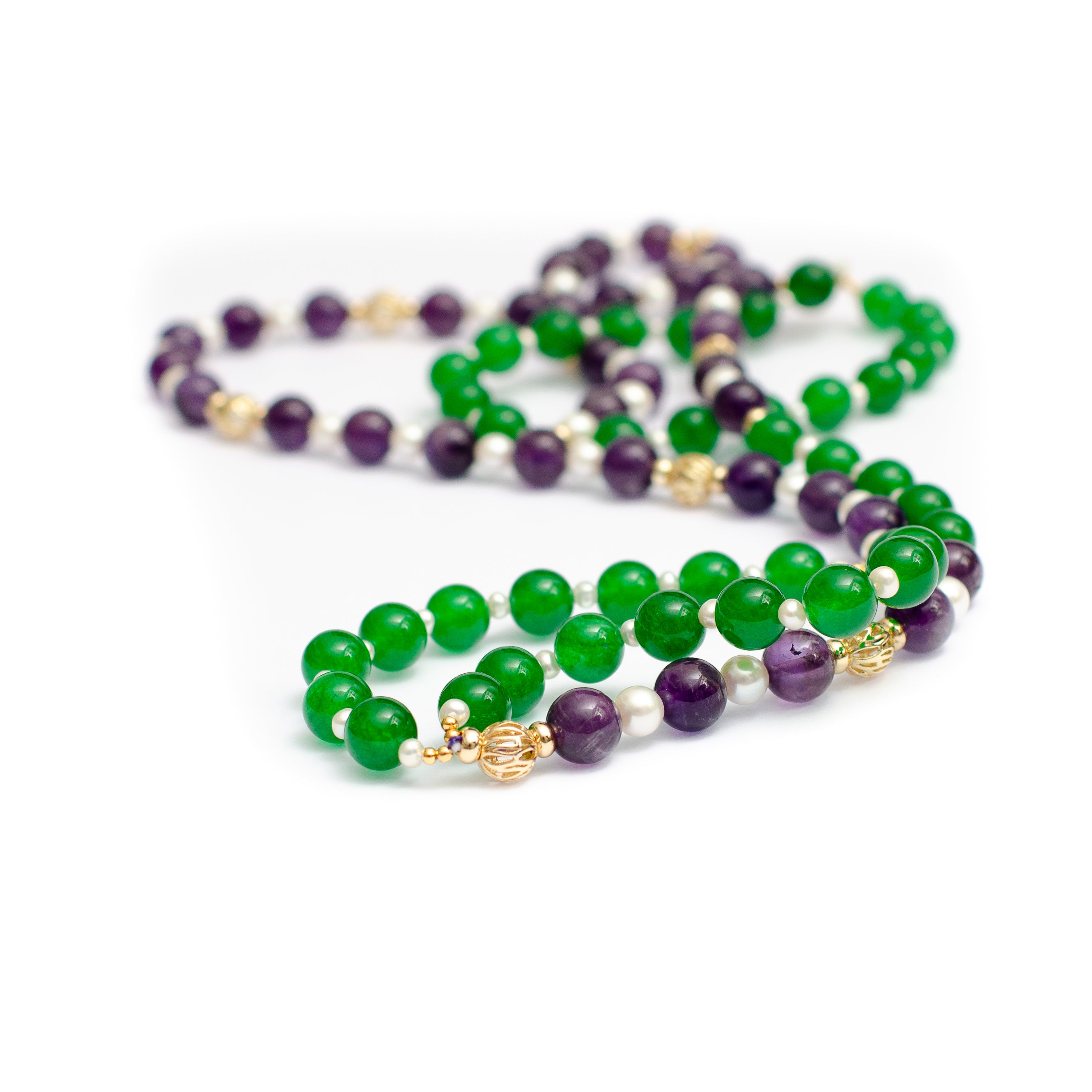 -The necklace is hand knotted with gold beads in between each jade and amethyst with an addition of white fresh water pearls -It has a comfortable magnetic clasp