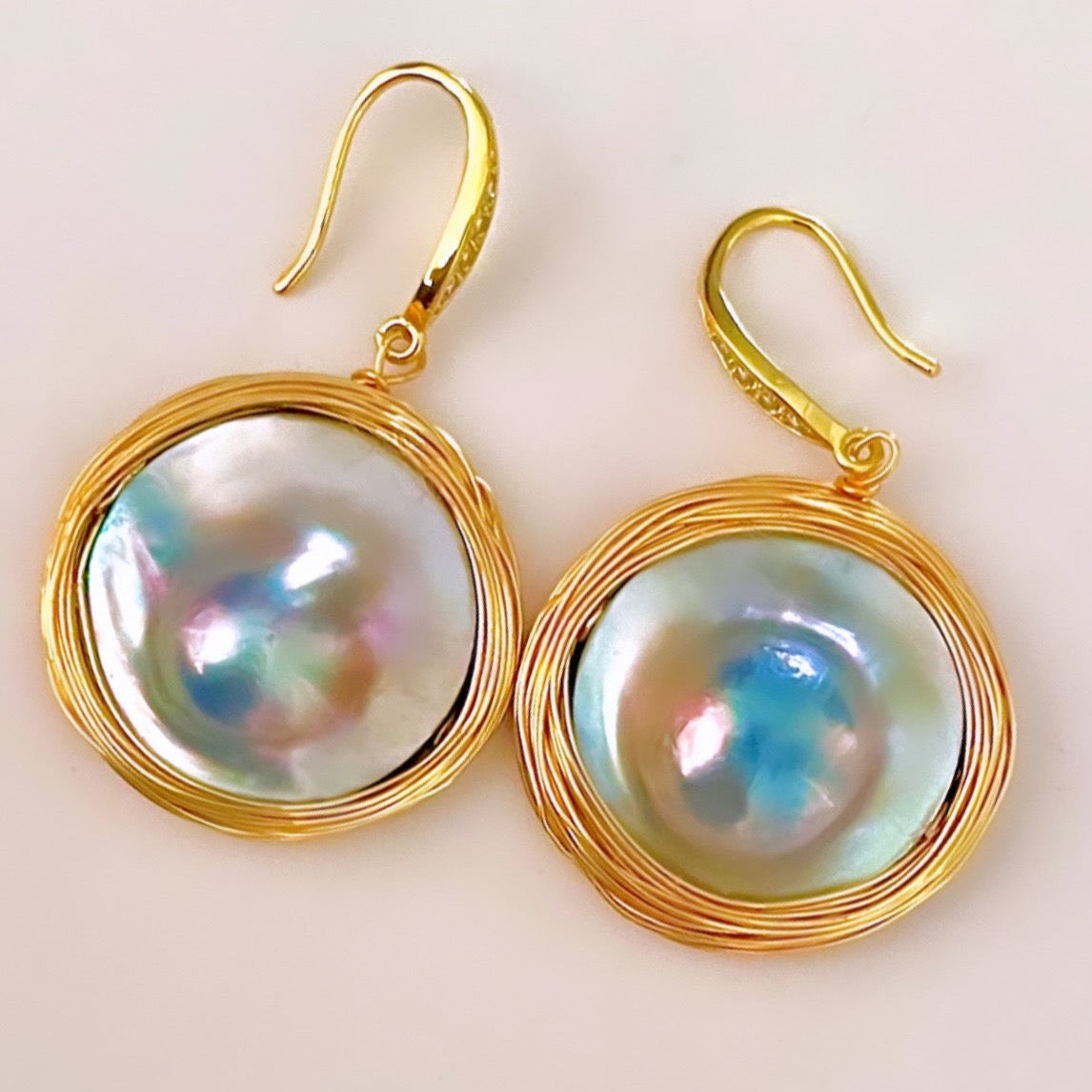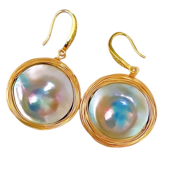 -Beautiful grey/blue mabe pearl earrings with gold wire