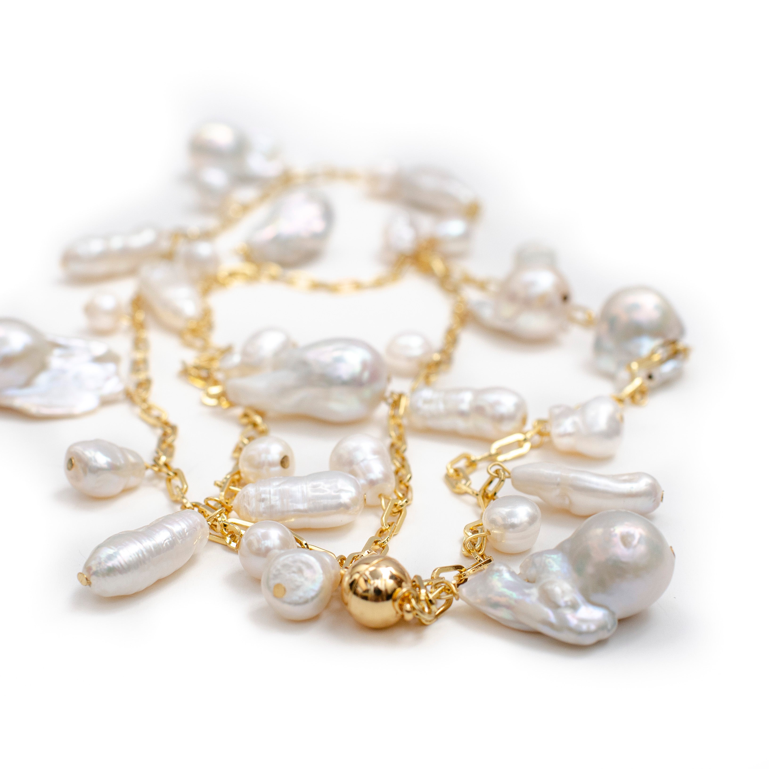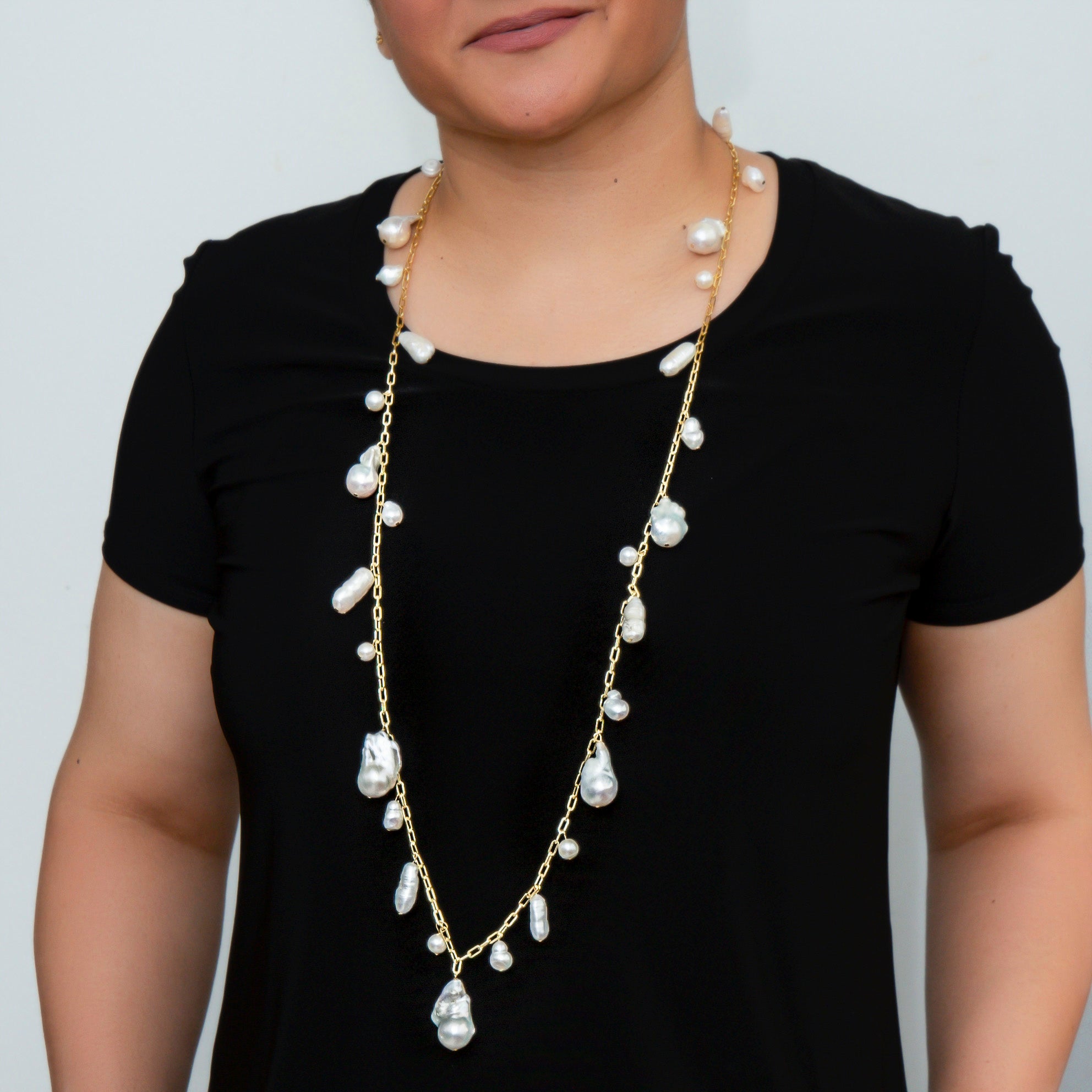 -Necklace is made with fine quality white fresh water baroque, potato and tooth pearls -The loop necklace is 18K gold plated on silver -Length of the necklace is 40 inches