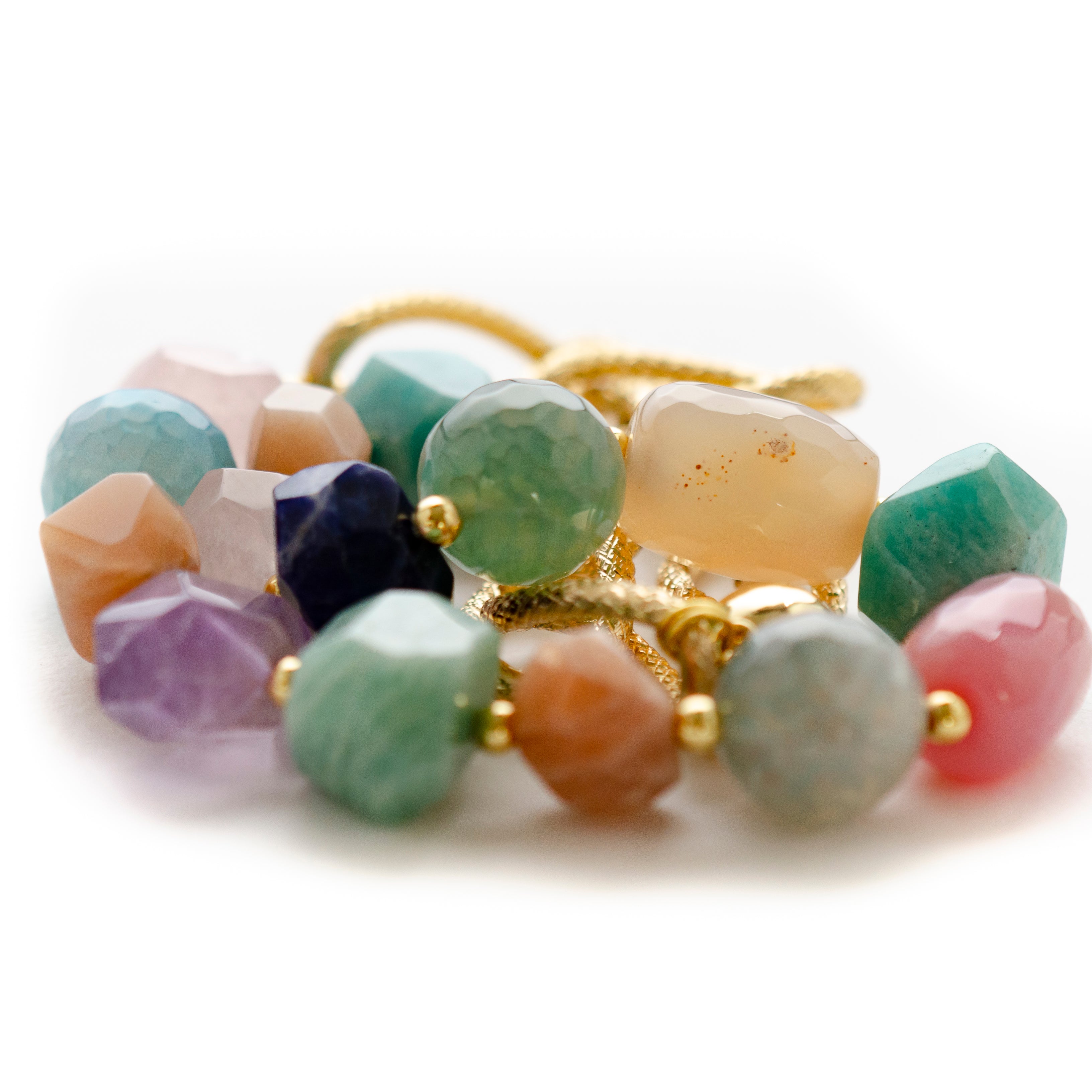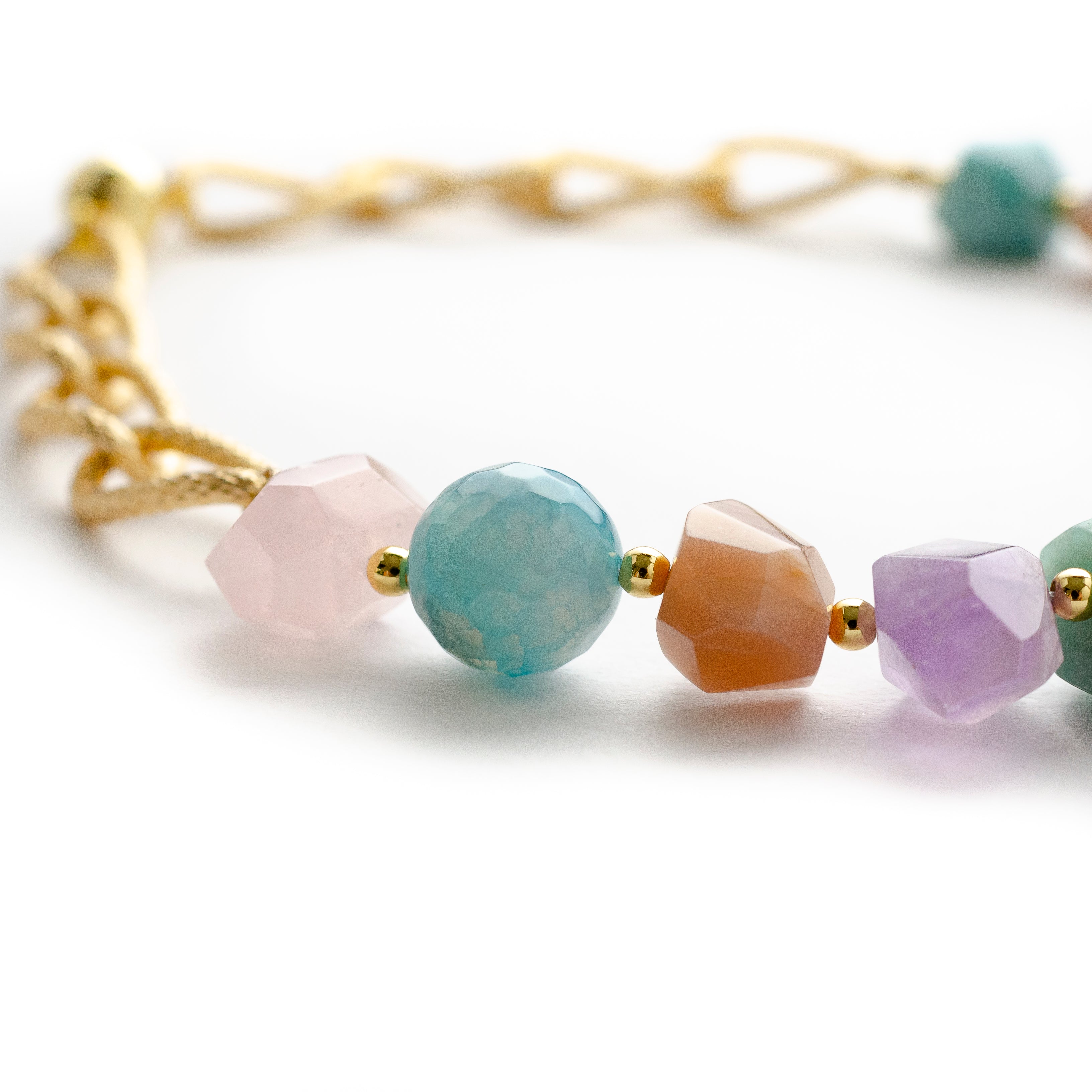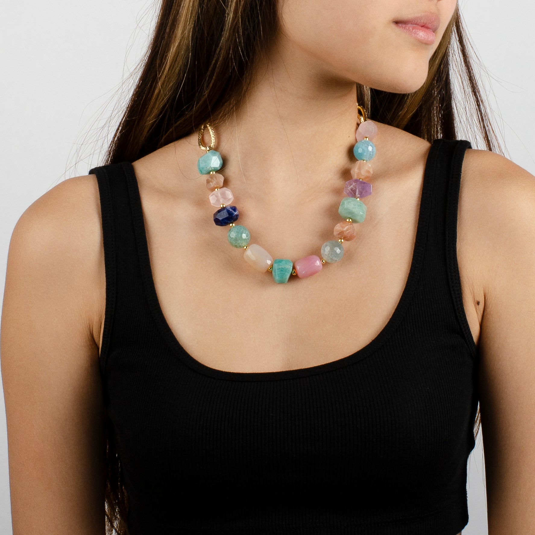 -Handmade with amethyst, aqua marin, amzonite, jade, torquoise, lapis, pink quartz and agate.