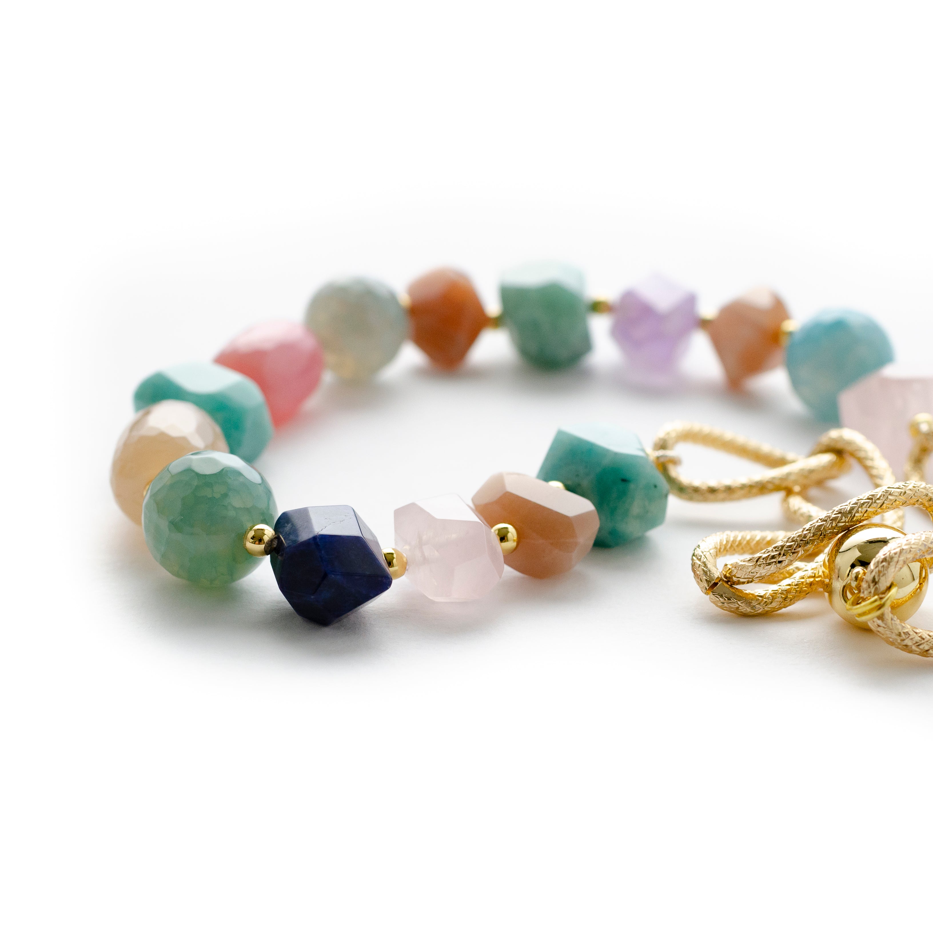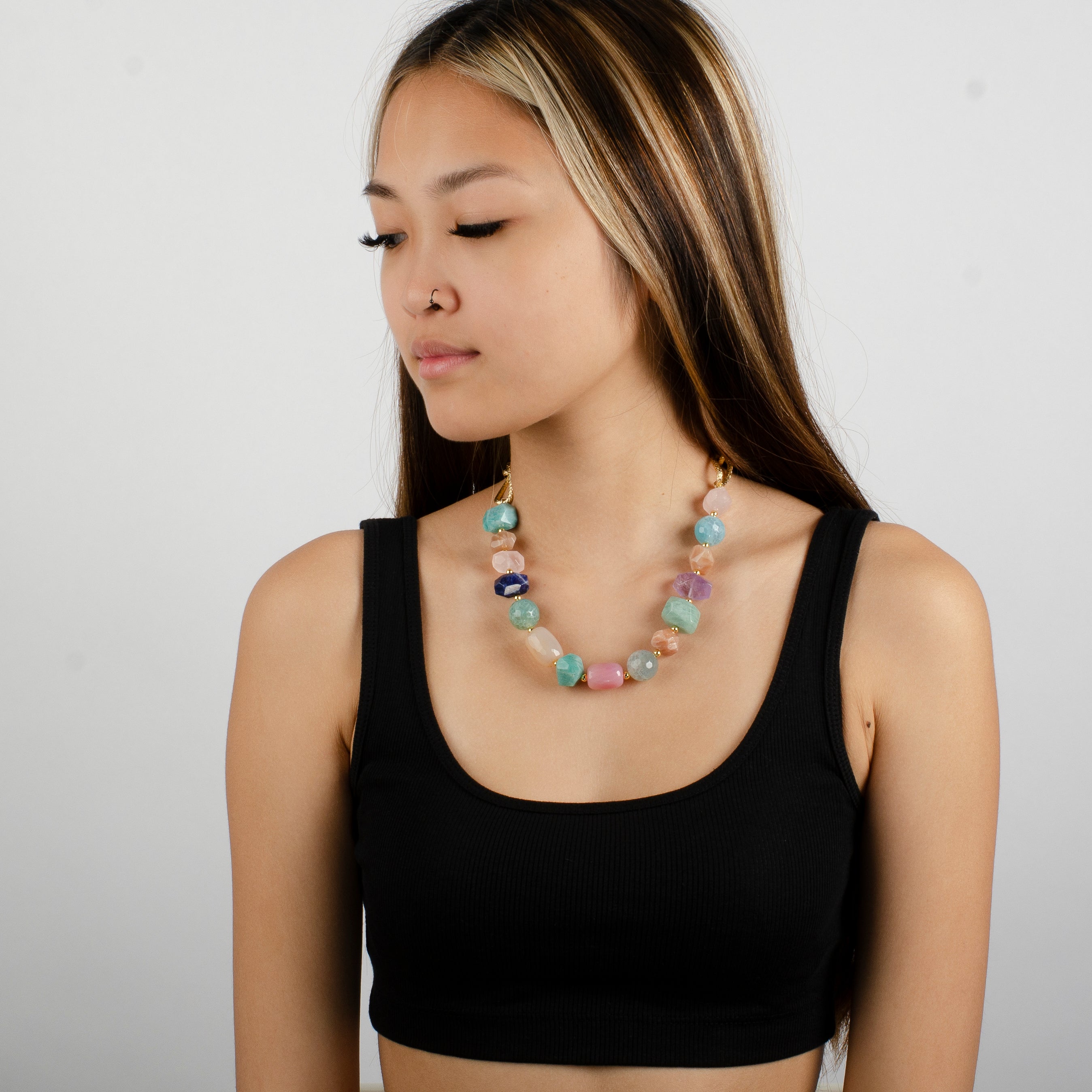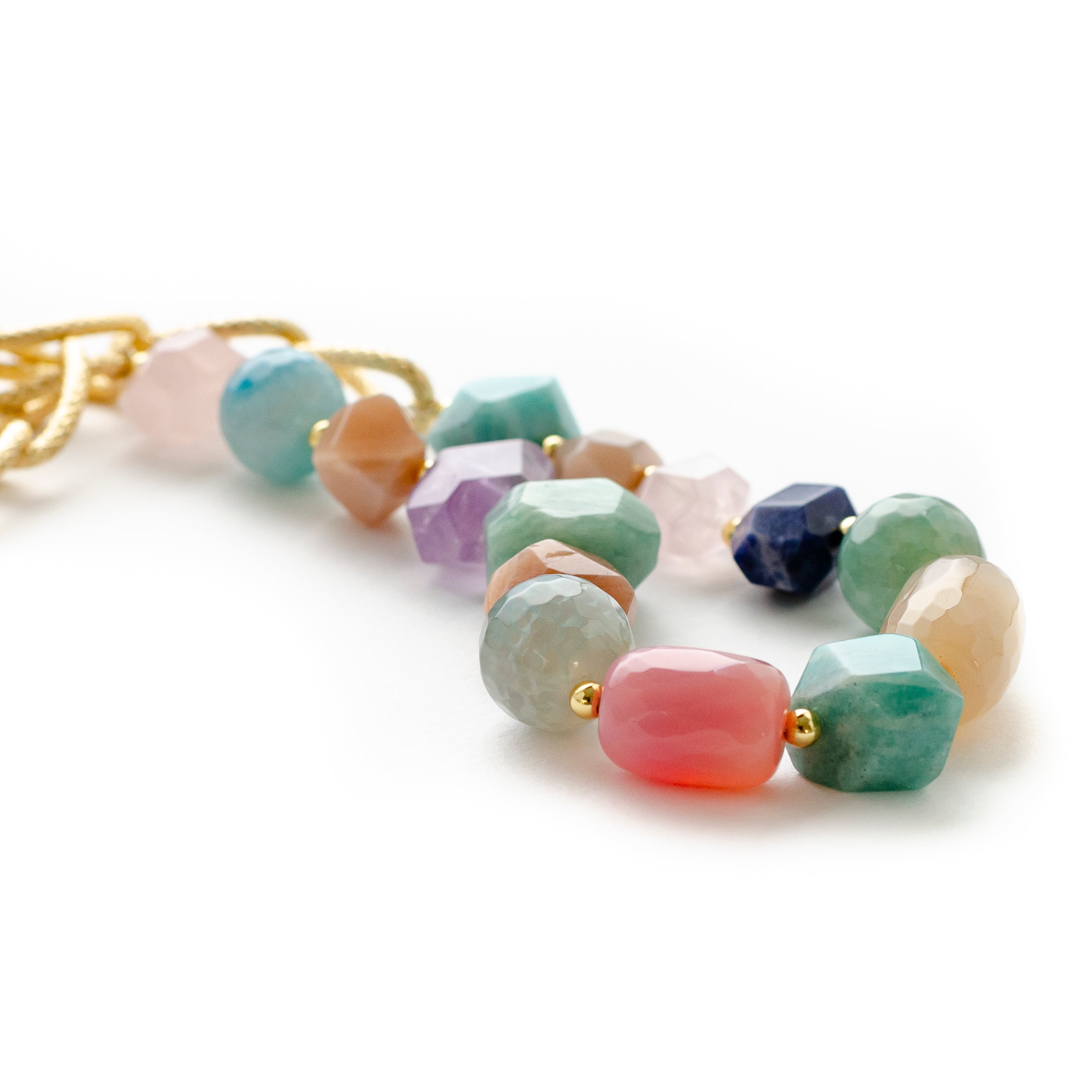 -Handmade with amethyst, aqua marin, amzonite, jade, torquoise, lapis, pink quartz and agate.