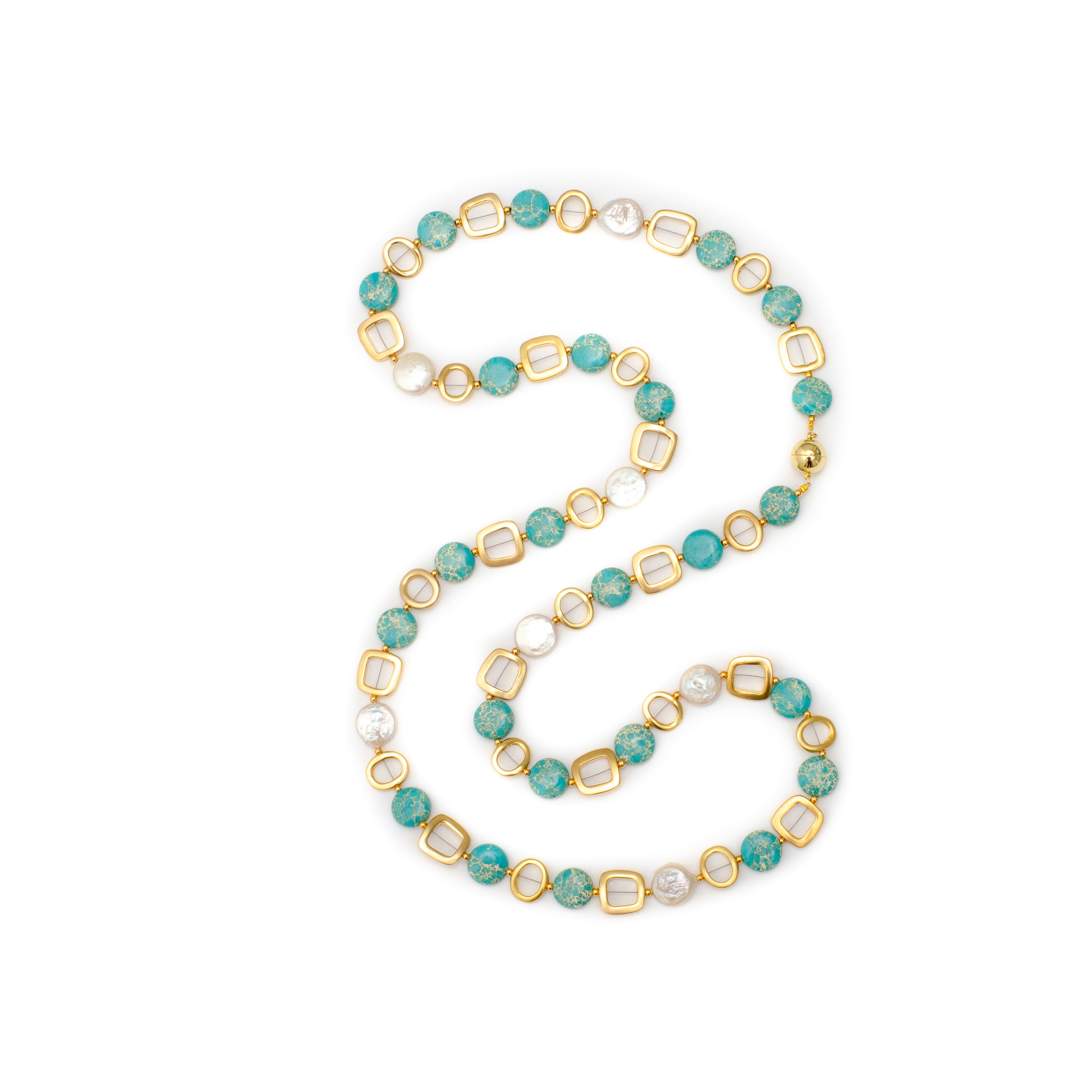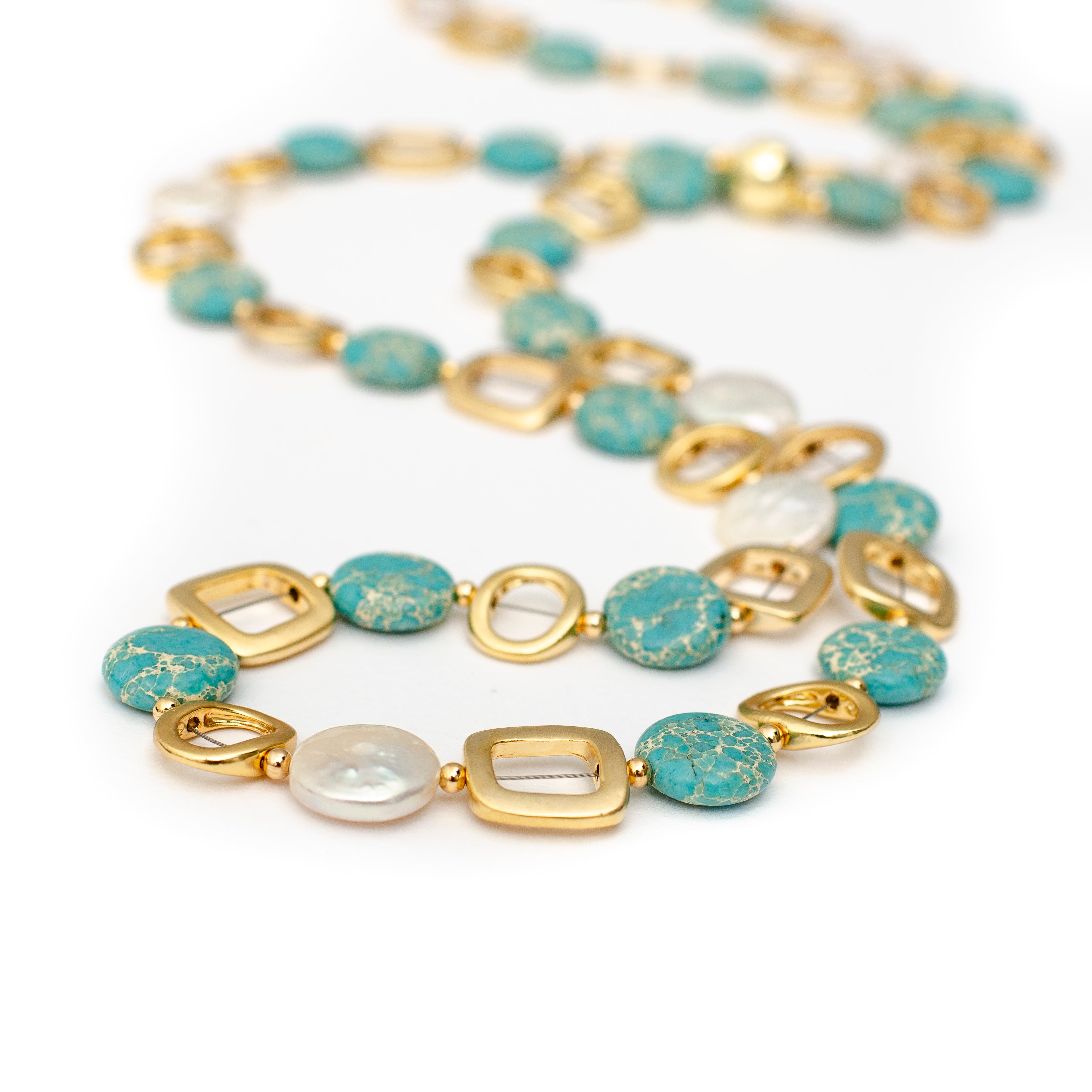 -Hand strung with coin pearls and gold plated nickel free squares