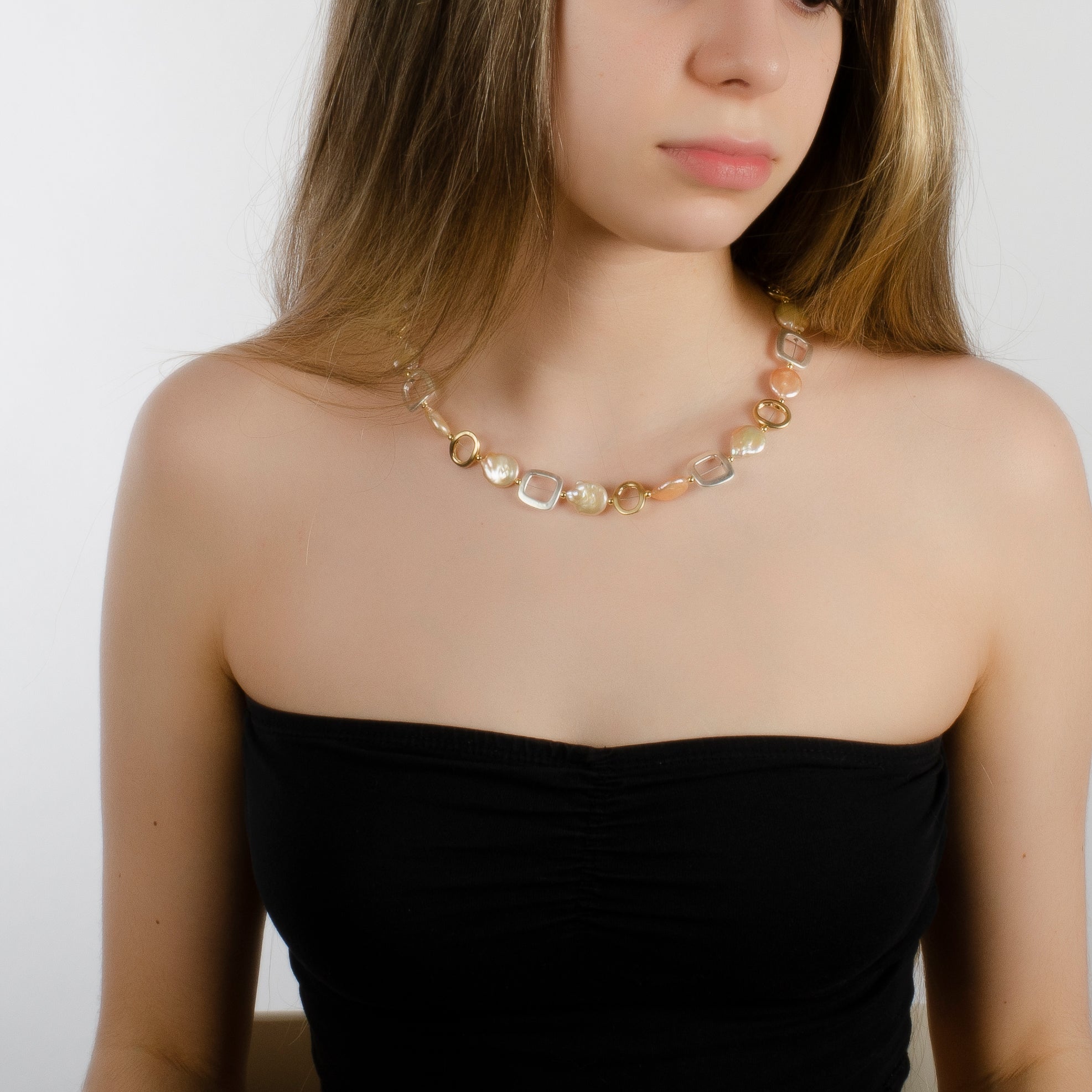 -Handmade with coin pearls and gold plated nickel free squares