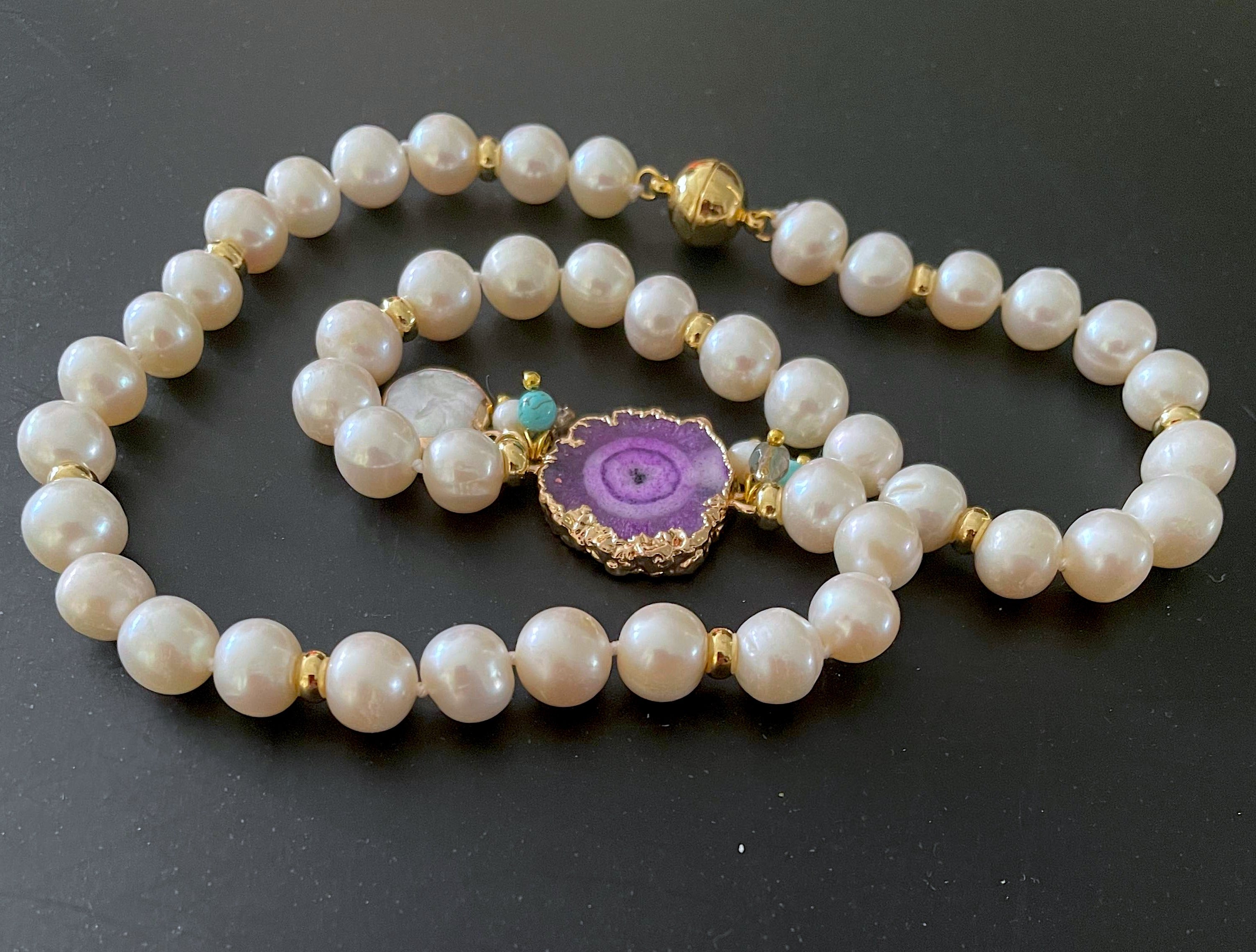 -Beautiful white fresh water pearls necklace with pink agate stone.                     – The necklace has delicate pearl charms attached with the agate stone