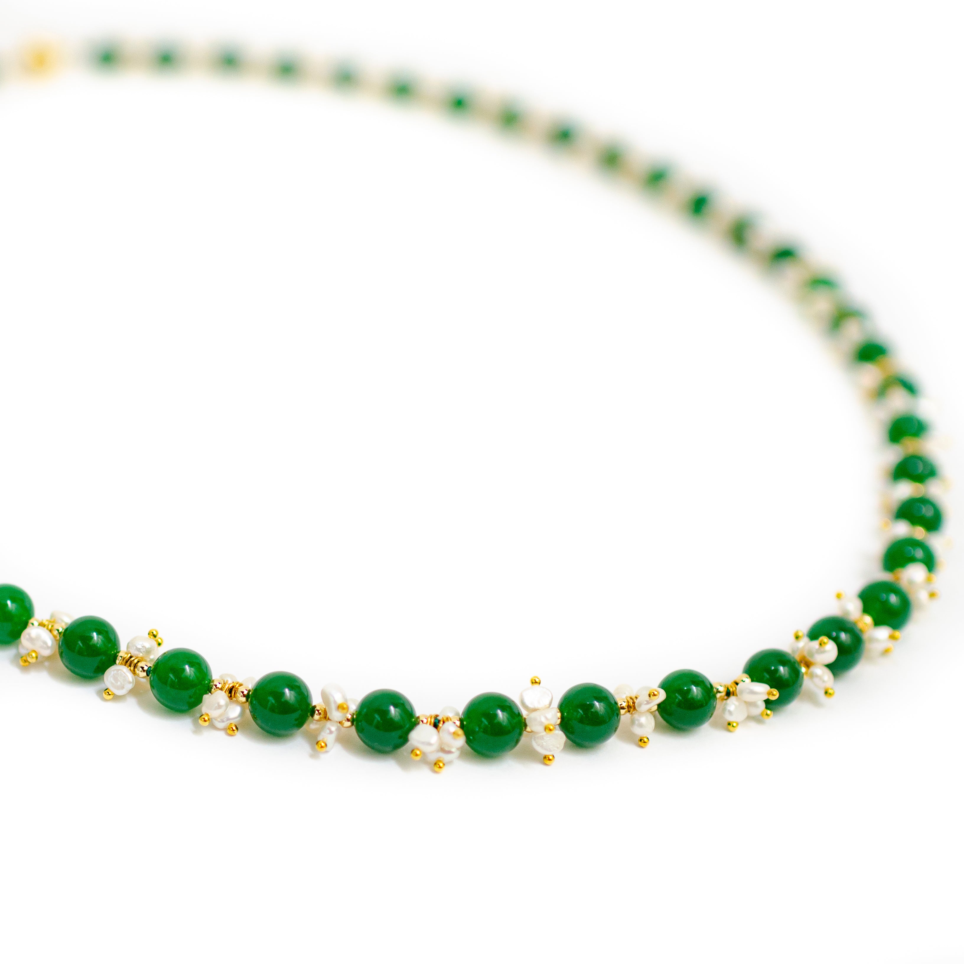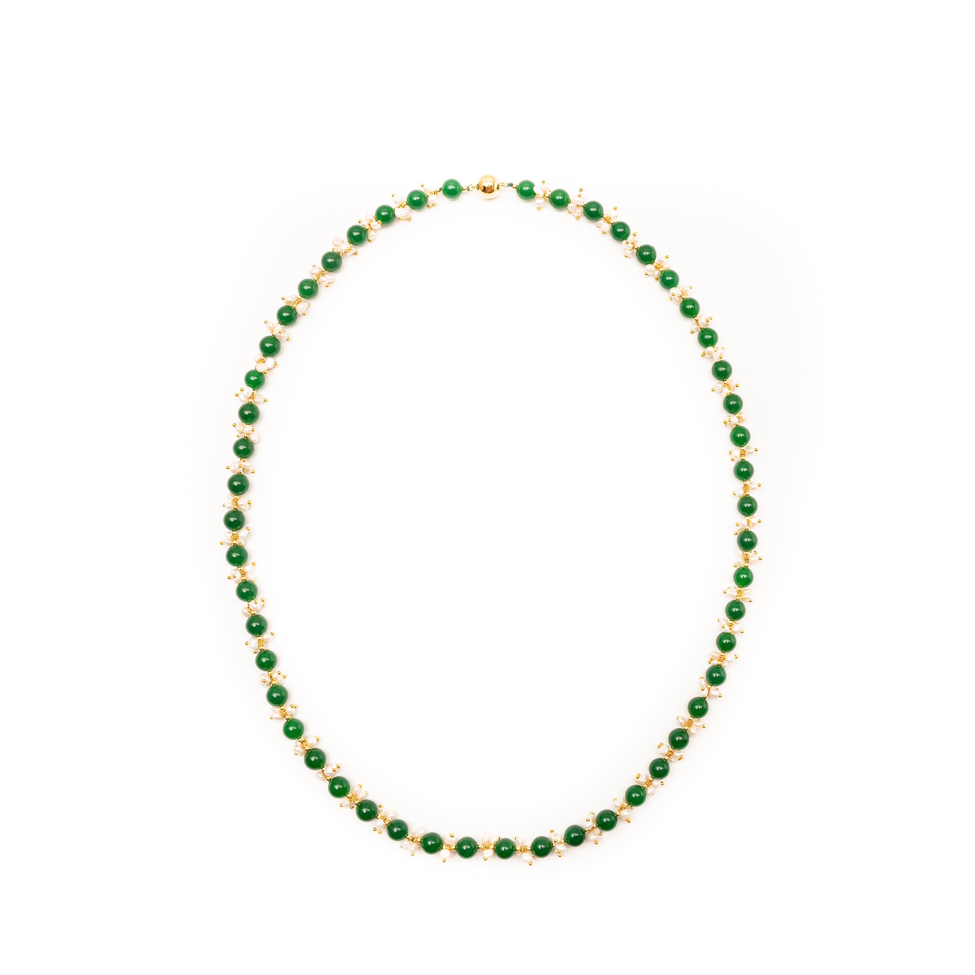 -The necklace is hand knotted with gold beads in between each jade and each pearls is hand strung with 18K gold plated wire                                                                                                          -It has a comfortable magnetic clasp