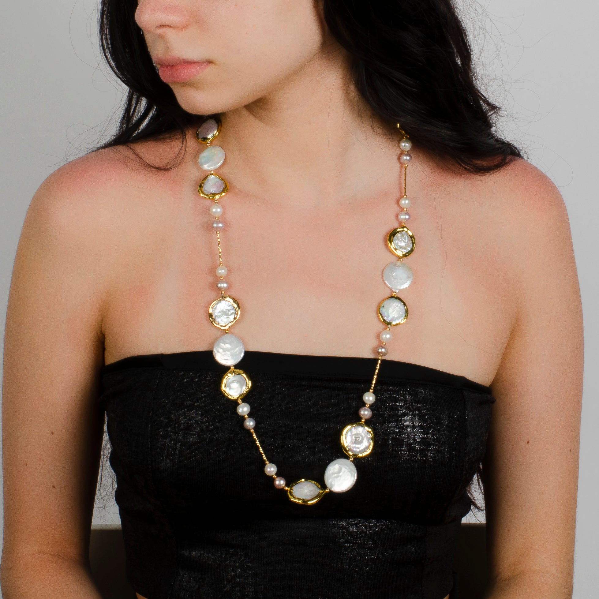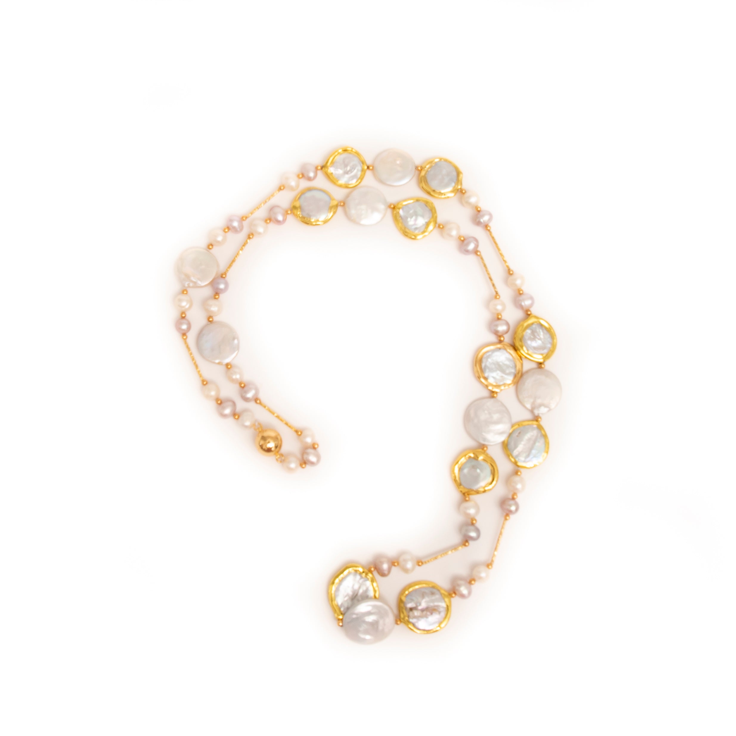 -Necklace is made with fine quality white coin pearls outlined in gold and chunky -The pearls are hand knotted with small round white and pink fresh water pearls with 18K gold plated wire