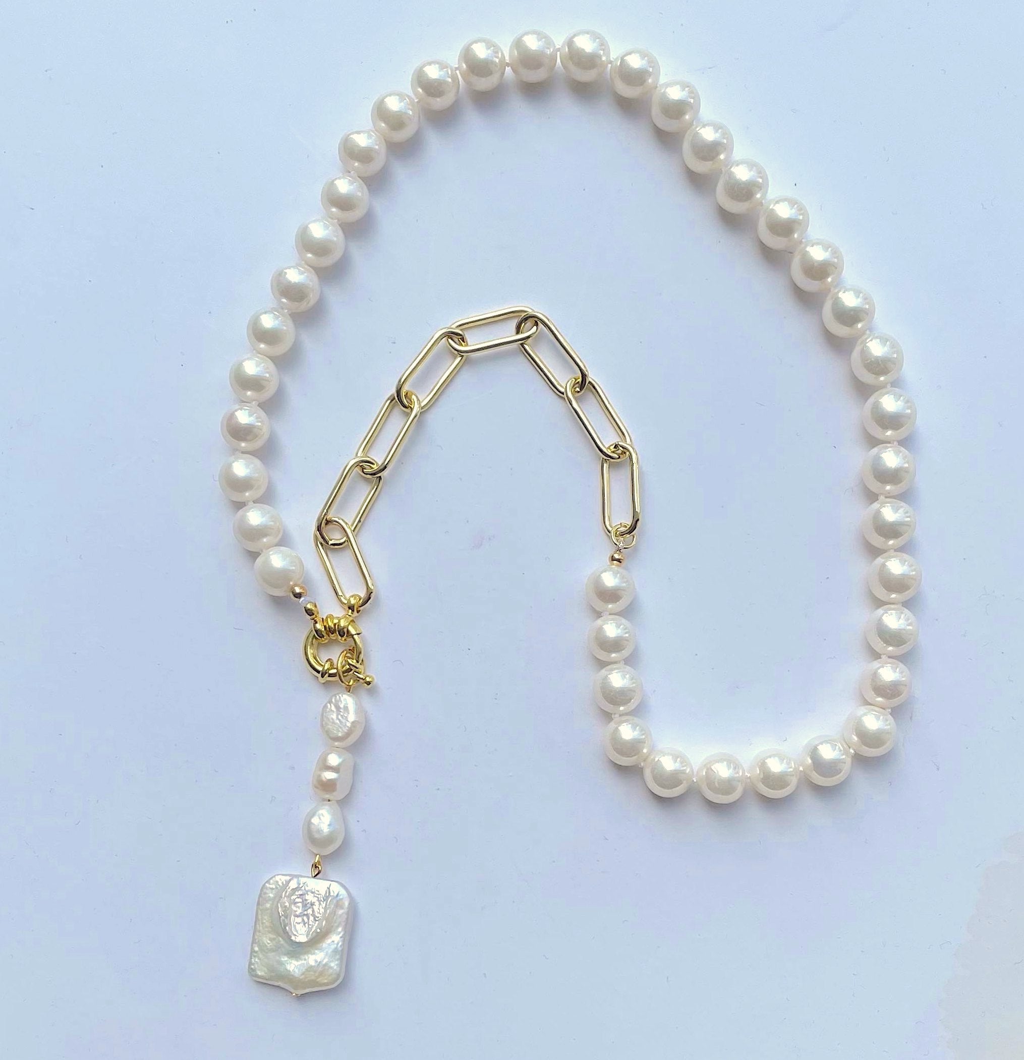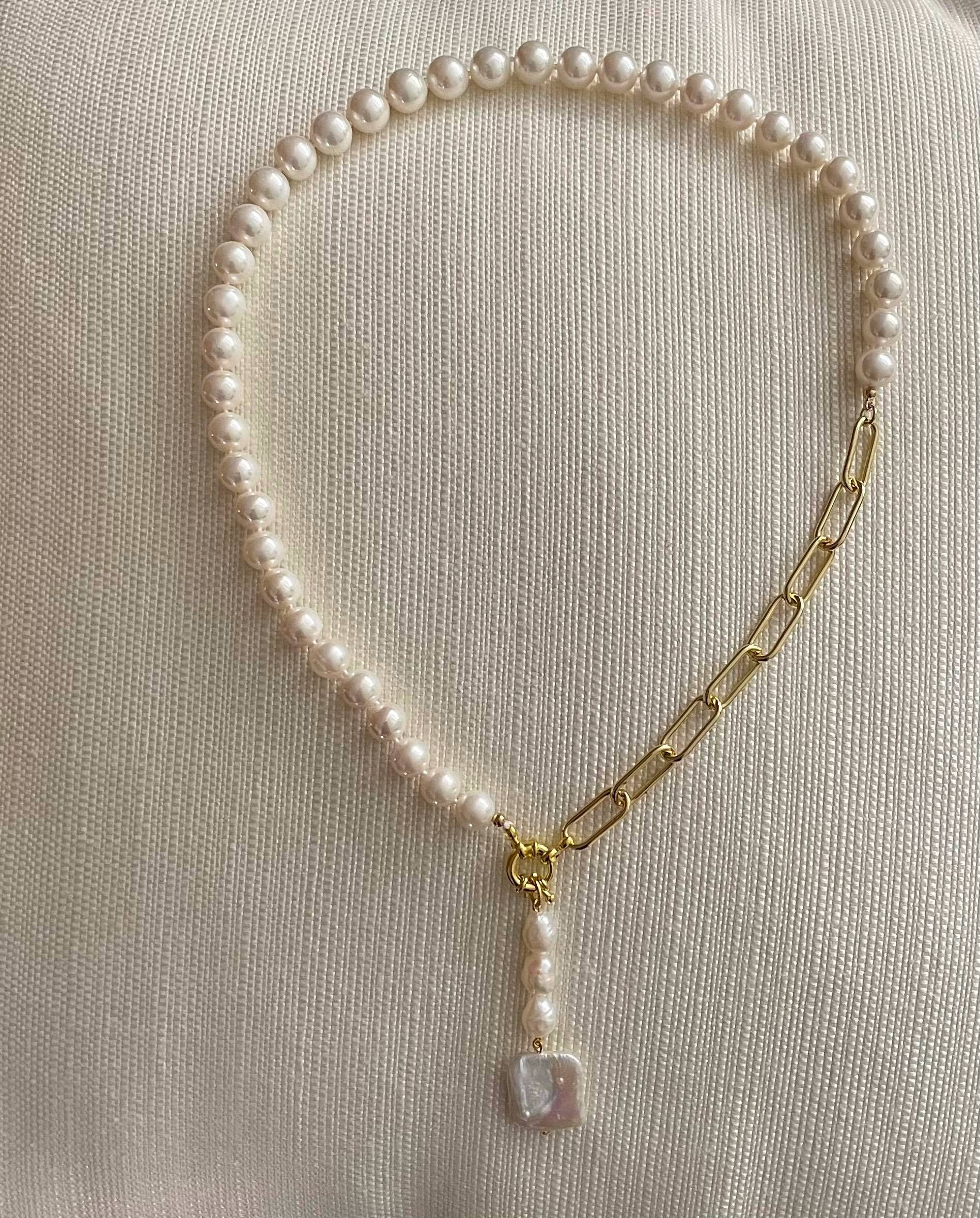 -Necklace is made with fine quality white fresh water pearls and loop chain -The pearls are hand knotted with a gold loop and pearl line with square baroque drop