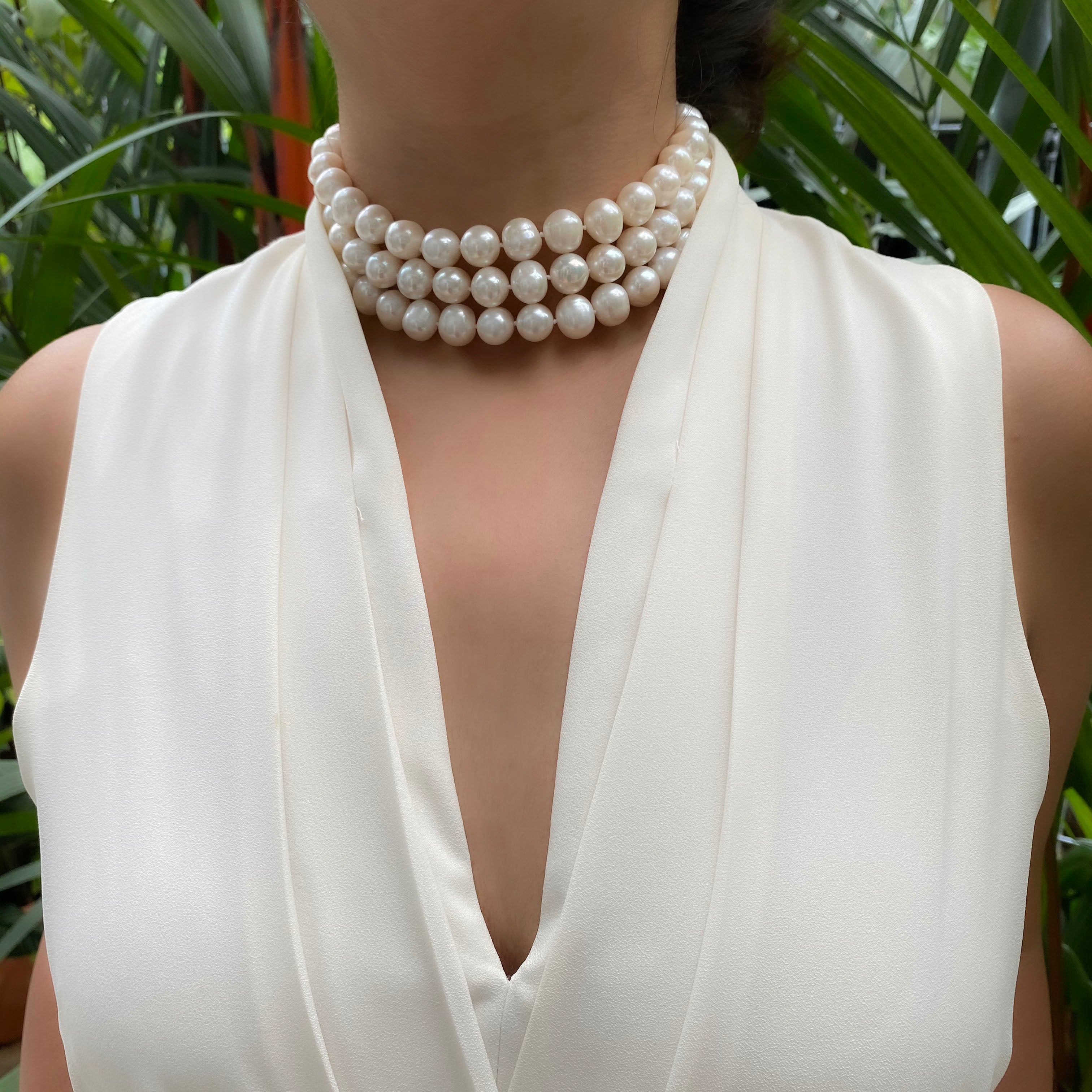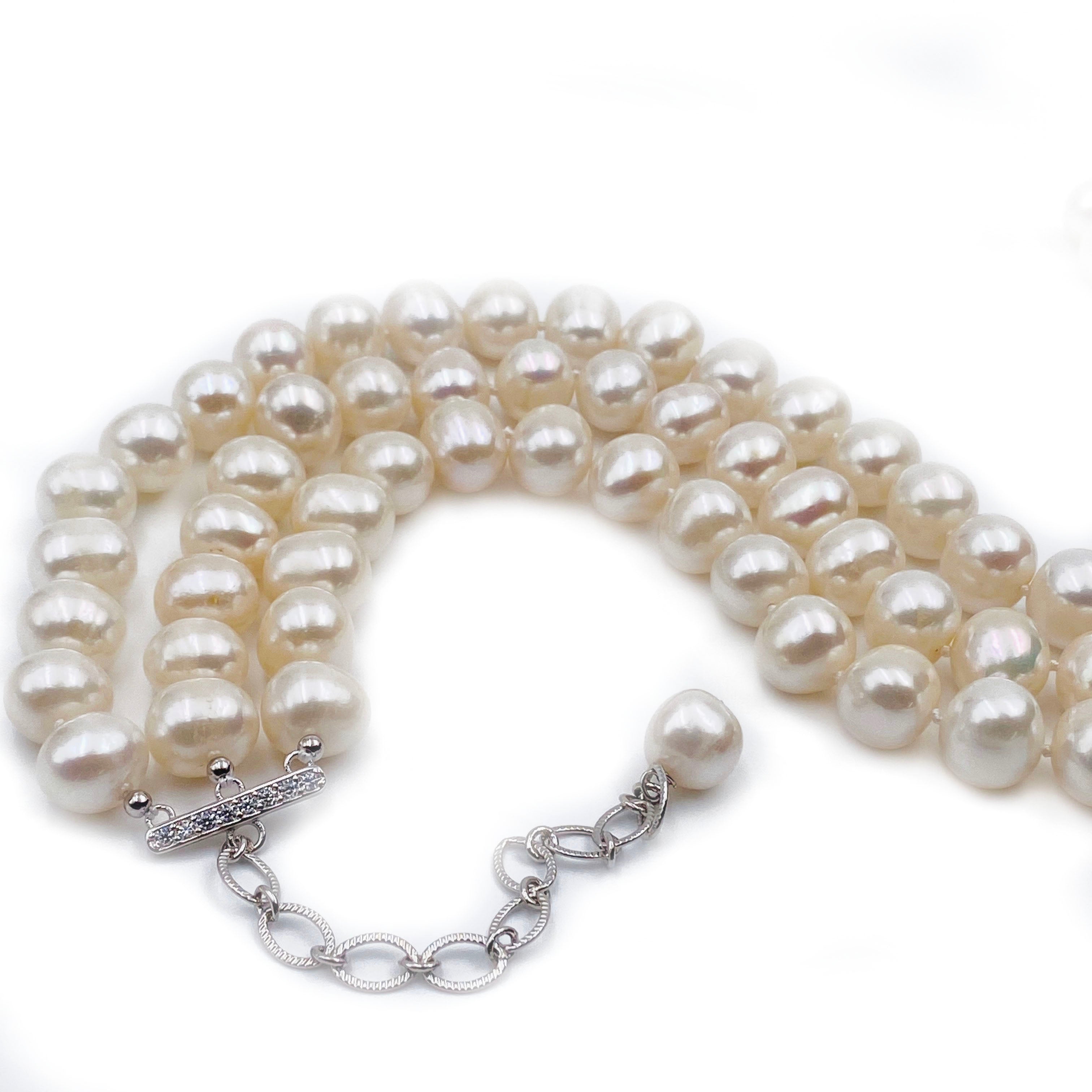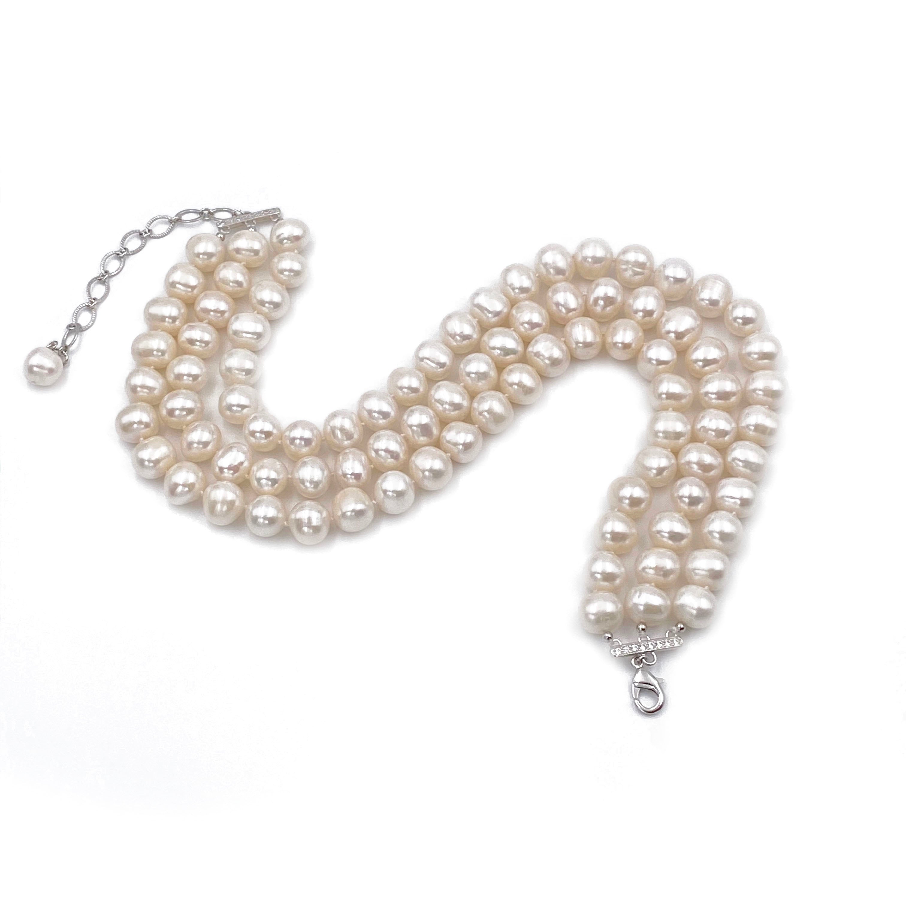 -The pearls are hand knotted with three strands of white pearls and it has a silver clasp that can be adjusted according to your neck size.
